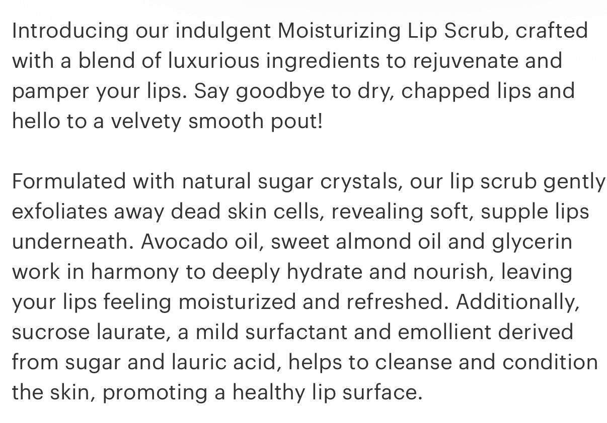 Formulated with natural sugar crystals, our lip scrub gently exfoliates away dead skin cells, revealing soft, supple lips underneath. Avocado oil, sweet almond oil and glycerin work in harmony to deeply hydrate and nourish, leaving your lips feeling moisturized and refreshed. Additionally, sucrose laurate, a mild surfactant and emollient derived from sugar and lauric acid, helps to cleanse and condition the skin, promoting a healthy lip surface.